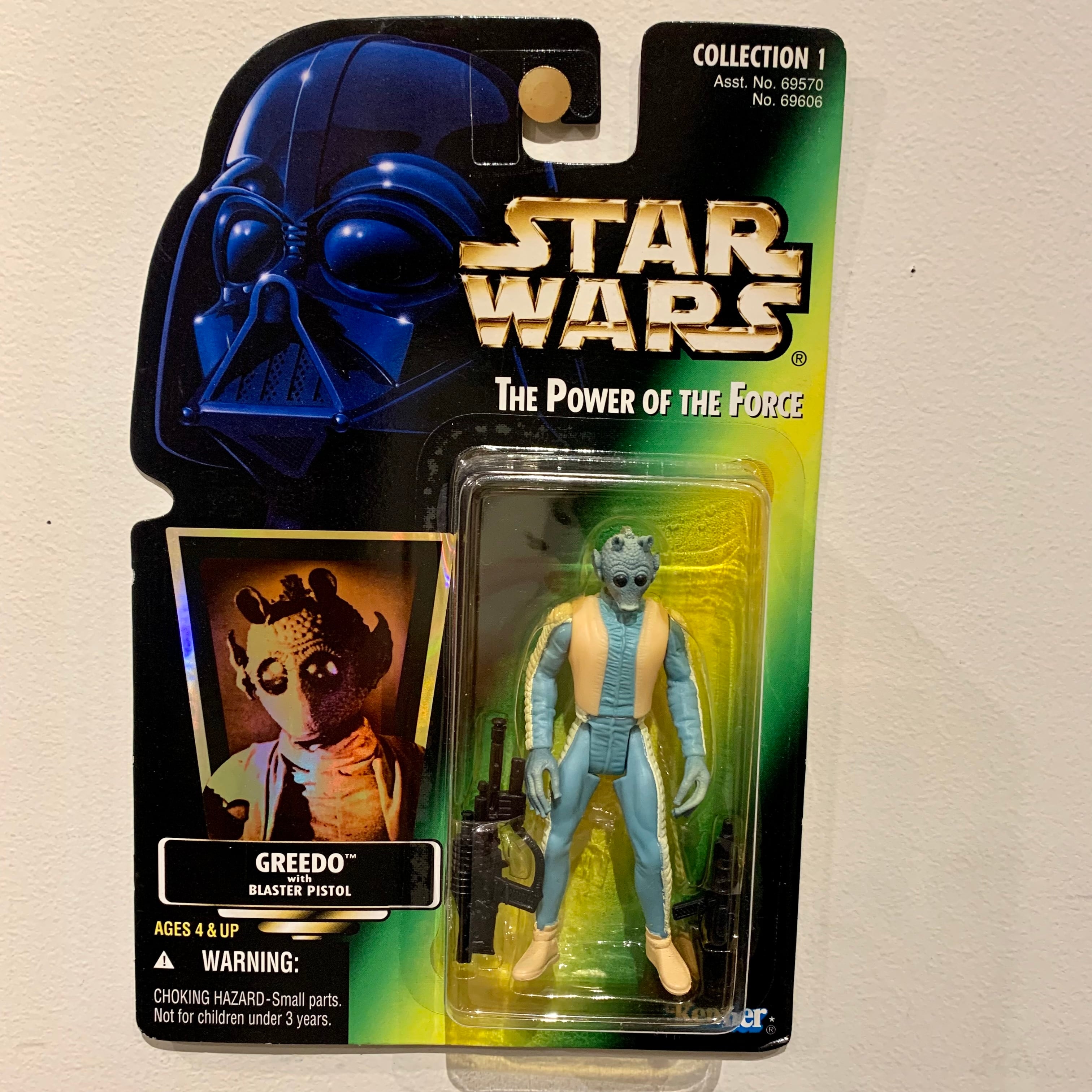 1996年に発売された「The Power of the Force (POTF)」シリーズのフィギュアで、台紙が緑色の「グリーンカード」。グリードはローディアンの賞金稼ぎで、ジャバ・ザ・ハットがハン・ソロに懸けた賞金を狙っていましたが、モス・アイズリーのカンティーナでハン・ソロに撃たれてしまいます。